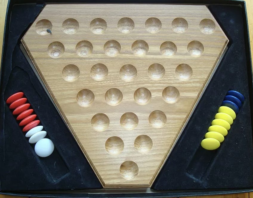 The board features 28 holes in which players place markers, with the goal of making an equilateral triangle of any size with one color.