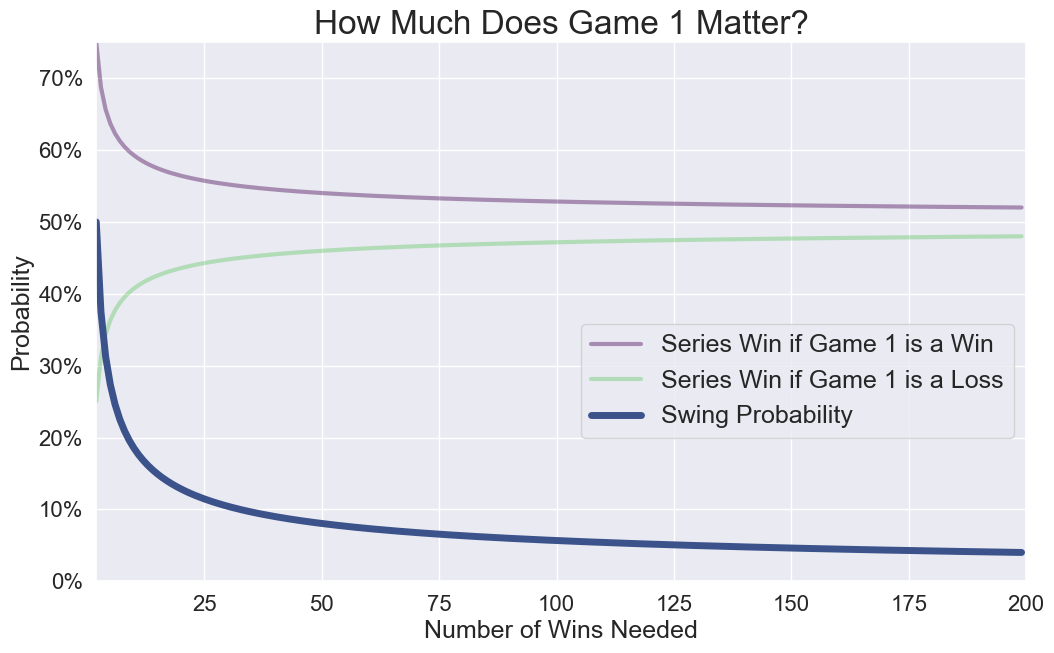 As the team manager, you are trying to motivate your team as to the criticality of the first game in the series (i.e., “Game 1”). You’d specifically like to educate them regarding the “probability swing” coming out of Game 1—that is, the probability of winning the series if they win Game 1 minus the probability of winning the series if they lose Game 1. (For example, the probability swing for a winner-take-all Game 7 is 100 percent.)