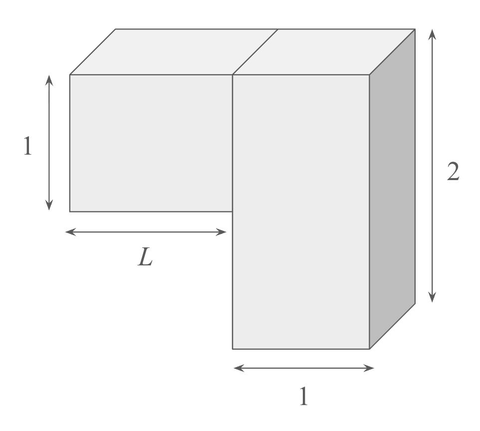 A block tower consists of a solid rectangular prism whose height is 2 and whose base is a square of side length 1. A second prism, made of the same material, and with a base that’s L by 1 and a height of 1, is attached to the top half of the first block, resulting in an overhang as shown below.