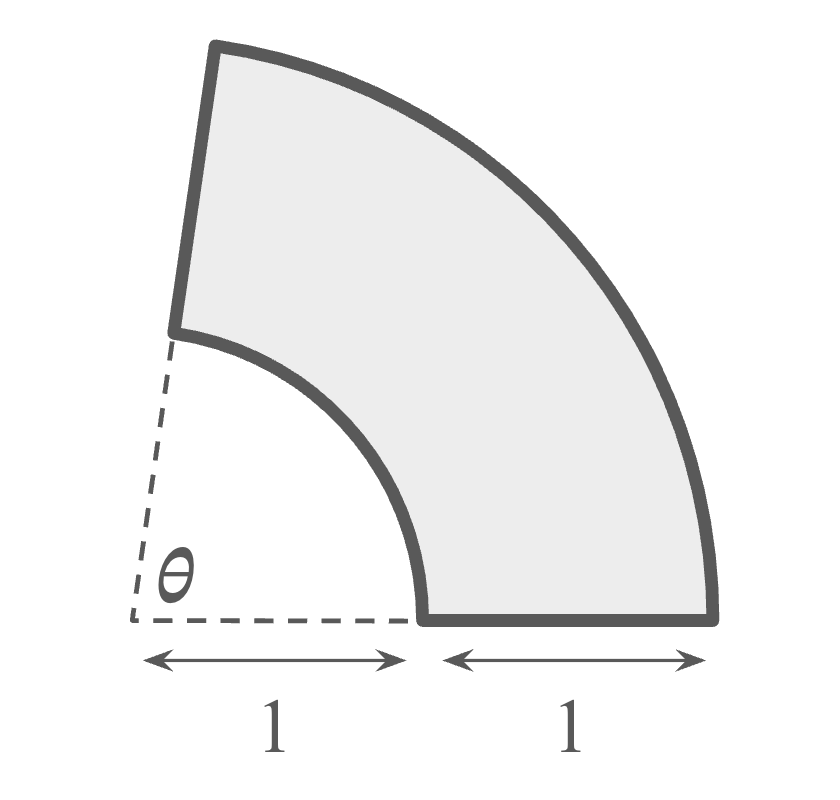 \begin{align*} 1 = & \dfrac{-\frac{L^2}{2} + L + 3}{2+L} \\ 2+L =& -\frac{L^2}{2} + L + 3 \\ \frac{L^2}{2} =& 1 \\ \end{align*}Instead of rectangular prisms, now suppose the tower is part of an annulus. More specifically, it’s the region between two arcs of angle 𝜽 in circles of radius 1 and 2, as shown below.