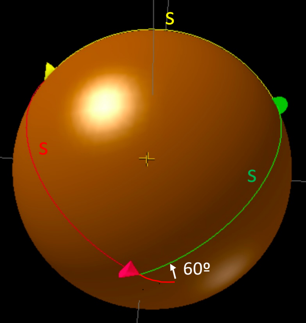 This creates an equilateral spherical triangle with $120^\circ$ for each angle.